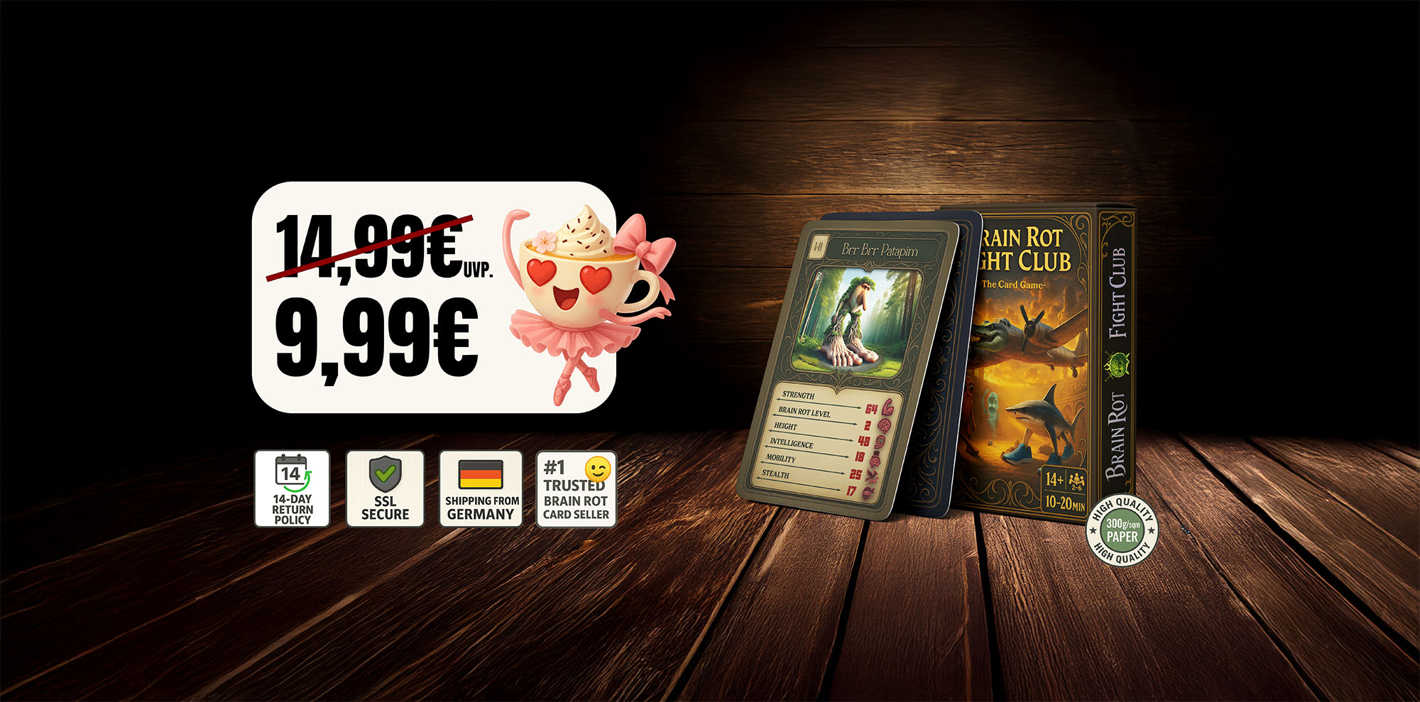 Willkommen beim Brain Rot Fight Club – dem verrücktesten Quartettspiel der Welt! 32 durchgeknallte Charaktere treten in sechs wilden Kategorien gegeneinander an. Skurril, düster, absurd – perfekt für alle, die auf Trash, Fantasy und abgedrehte Duelle stehen.